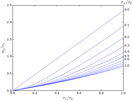 We integrate equation (39) numerically using equation (34), to obtain the function shown in Figure 1 for different values of , indicated for each curve in the figure, where is an arbitrary scaling parameter, , , and . Note that the relation is not linear. If we compare it to the identity line () shown as a dashed line, we note that sometimes the curves of constant lie above or below the identity line, or even cross it.