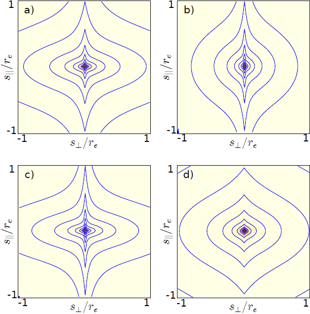 Figure 2 (a) shows the case that corresponds to the parameters used for Figure 1: , and AP = 1, where the geometrical distortions produced are evident, an elongation in the polar direction and a squashing in the equatorial direction. As can be noted the polar elongation resembles the structure known as FoG.