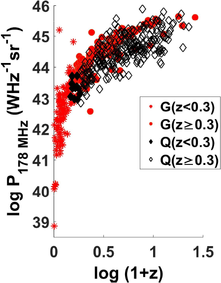 Generally, for the sample and -subsamples considered, the ratio for various Q-subsamples. The similarity of Q-values for quasars and galaxies for different Q and z subsamples may be regarded as a pointer to the same micro-physics at work in the evolution of these radio sources (see Ryś 1994, 2000).