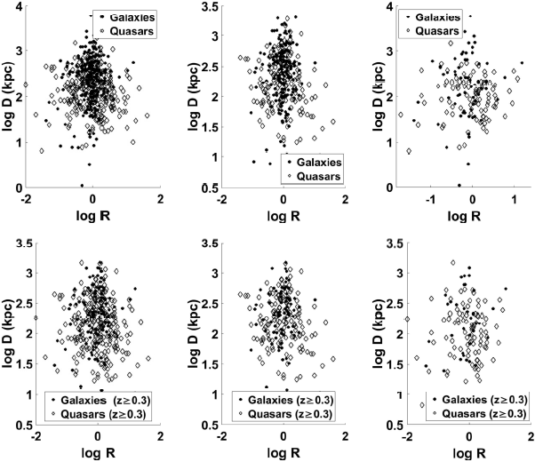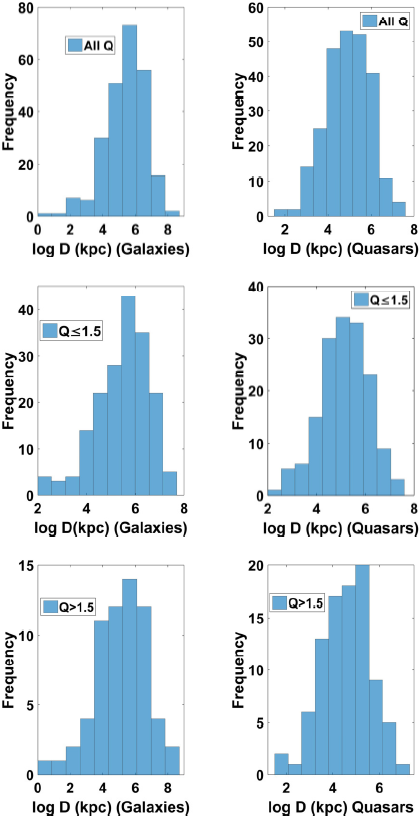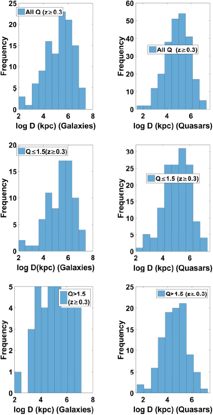 At z > 0.3, there is a noticeable difference in the distribution of the linear sizes of galaxies and quasars (shown in Figure 3), which seems to increase with increasing Q. For quasars at all Q (Q ≤ 1.5 and Q > 1.5 combined) sample, the D distribution approximates lognormal; but for the galaxies, for Q > 1.5 subsample, the projected linear size distribution seems constant from above 100 kpc to more than 1000 kpc. The remarkable differences in the distribution of D for Q > 1.5; z > 0.3 between galaxies and quasars may be due to selection and beaming effects. At large z, it is expected that only relatively large sized galaxies of higher luminosity will be easily observable (the median luminosity of galaxies for Q > 1.5, z ≥ 0.3 is a factor of 7 higher than that of Q > 1.5, z < 0.3). The median redshift for Q > 1.5; z > 0.3 is: for quasars (zmedian ≈ 1.0) and for galaxies (zmedian ≈ 0.7). Environmental differences, if present in the host galaxies, may be responsible for this observed difference, since the density of the universe scales as . By implication, the observed quasars in our sample are found in more dense environments and may suffer greater restraint in expanding to all possible dimensions, while galaxies suffer less restraint and may attain all possible sizes.