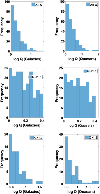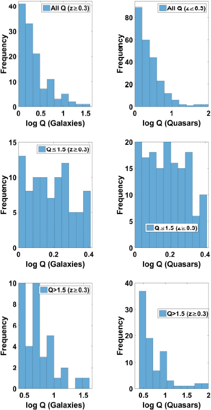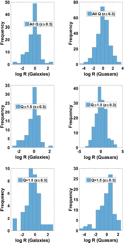 Figure 4 shows the distribution plots of Q for the whole sample and the z-subsample. The distributions appear similar for quasars and galaxies for all the different Q-subsamples (right skewed for Q > 1.5 and for all Q subsamples but seem to have a constant distribution for the subsample 1 ≤ Q ≤ 1.5). For the z > 0.3 subsample, (see Figure 5), the Q distributions for the quasar and galaxy subclasses are similar as is the case for the all −z sample. In Figures 6 and 7 we display the distribution plots of lobe-luminosity ratio, R, for radio-loud quasars and FR-II radio galaxies for the whole samples and various z and Q subsamples. The distributions appear lognormal for both classes of object. These distributions show that the observed asymmetries must have been caused by a number of independent factors (relativistic beaming, selection effects, environmental effects, etc.).