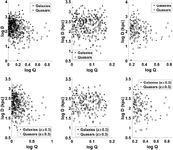 The D − Q relation using the mean and the median values of the binned samples indicates a strong anti-correlation for both quasar and galaxy subclasses, except for the quasar subsample with for both z ≥ 0.3 and all z bins, which suggest no correlation (with ). This result is consistent with beaming and orientation effects for both quasars and galaxies, even at large scales, and seems independent of redshift. The power-law index is similarly strong for both redshift bins. The observed absence of any significant correlation for quasar subsamples with is an indication that for such less asymmetric quasars there are other important factors that interfere with the beaming effect.