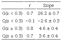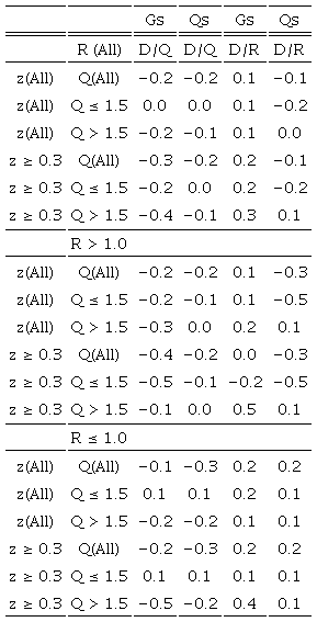 In Figures 8 and 9 we show the D − Q/R data for the different z and Q subsamples. The results of the one-dimensional regression analyses of the plots are shown in Table 3. Equations (2) and (3) imply that if , then . Our sample however shows that 49 % of the quasars and 57 % of the galaxies have R ≤ 1, implying that relativistic beaming alone cannot explain the observed R-data. We have further subdivided our sample and subsamples to include sources with and R > 1.0 (see Table 3). We hereby show the average values of the observed parameters in Table 4, the orientation and the asymmetry parameters in Table 5 (in form of the ratios of DG /DQ , QG /QQ and RG /RQ for the different z and Q subsamples) and the matrix of their correlations in Table 6.