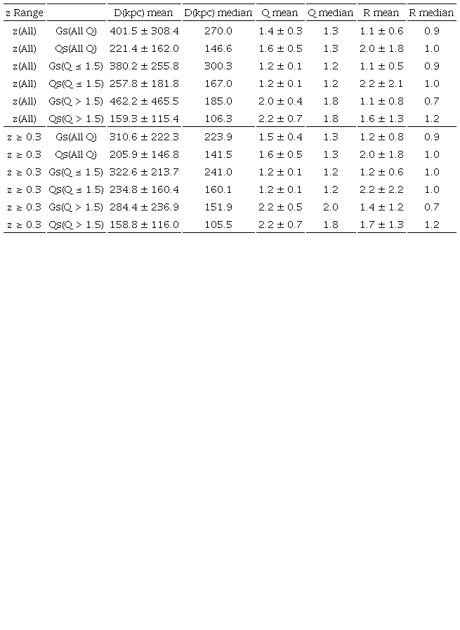 We show in Table 2 the results of the average values (the means with the associated error and the median values) for the analysed radio source parameters (D, Q and R) for the different ranges of z and Q subsamples. Generally, the projected linear sizes of galaxies appear to be larger than those of quasars . Based on the median value data, the ratio for the whole sample and for the two Q-subsamples (for all z), but it decreases to for the z-subsample and the two Q-subsamples (for ). This is consistent with the quasar-galaxy unification scheme, in which quasars are believed to be the beamed counterpart of radio galaxies which form the parent objects (e.g. Barthel 1989).
