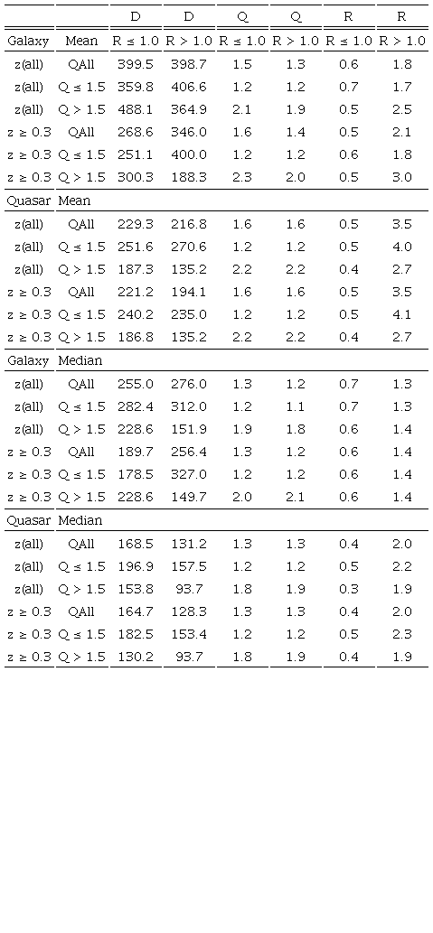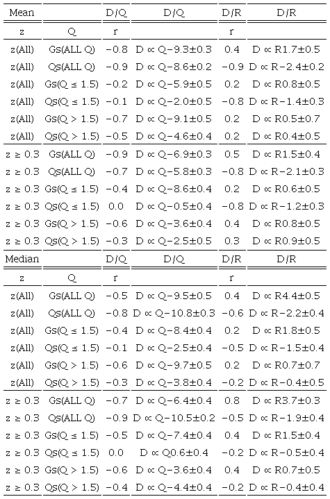 We divided each subsample into 10 (this choice is arbitrary, though motivated by the fact that the histogram plots were arranged into 10 bins). We evaluated the averages (mean and median) of each bin, which we used in the regression analysis shown in Table 6. In the power-law fitted to the D − Q/D − R relations, we have assumed that the power-law index is an indication of the strength of the relation, while the associated error indicates the level of scatter.