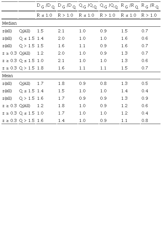 Table 4 indicates that linear sizes of FR-II radio galaxies depend on both Q and R; being larger for less asymmetric sources than for more asymmetric sources (Q > 1.5) with and the reverse for R > 1.0. For the quasar subclass, D decreases with Q independent of R. From Table 5, it can be seen that the asymmetry ratio QG /QQ appears independent of R and z, while RG /RQ appears dependent on z. If radio loud quasars and FR-II radio galaxies differ by simple orientation, these ratios are expected to be independent of z, especially for all sources with R > 1.0. Similarly, the orientation parameter DG /DQ is expected to be dependent on Q and R for all R > 1.0 but independent of z for all sources with . This is generally true from Table 5, where it can be seen that DG /DQ is smaller for more asymmetric than for less asymmetric sources.