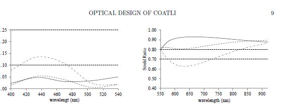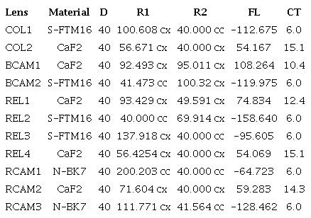 All lens groups except for the red camera (excluding the pupil camera lens, which is a comercial component) are non-cemented doublets of calcium fluoride (CaF2) and Ohara S-FTM16 (Brown et al. 2004). The optics workshop of the IA-UNAM (Instituto de Astronomía Universidad Nacional Autónoma de México) has experience in polishing the two materials for the near infrared instrument FRIDA (Cuevas et al. 2006). The red camera telephoto is N-BK7/CaF2/N-BK7 triplet. This group on its own produces a relatively high axial chromatic shift, however the red camera is not strongly powered and the chromatic shift induced by it is opposite to the residual chromatism left by all the previous optics. This leaves the red channel nearly apochromatic. No aspheric surfaces are present in the design, which will allow all the lenses to be manufactured in the optical workshops of the Instituto de Astronomía of the Universidad Nacional Autónoma de México (IA-UNAM). Table 1 shows the optical prescriptions of all the lenses of COATLI, where D is diameter, R is curvature radius, FL is focal length and CT is center thickness. Negative and positive focal lengths indicate divergent/convergent lenses and all units are milimeters.