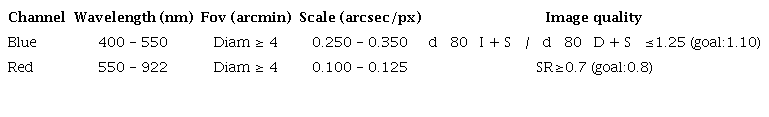 The requirements in FoV are specified for an appropriate coverage of the isokinetic angle, which is expected to be about 2 arcmin (Watson et al. 2016). The plate scales are specified with an upper limit given by the need to sample at the seeing limit in the blue channel, and to sample the best expected images of 0.25 arcsec FWHM in the red channel. The lower limits are to reduce the contribution of the detector noise when oversampling.