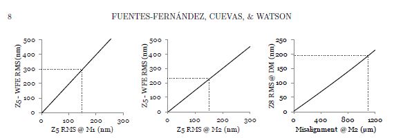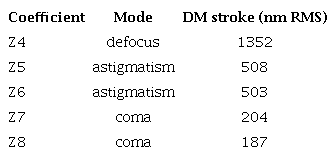 Figure 6 shows the Zernike coefficients Z5 and Z8 (representative for astigmatism and coma) in wavefront error (WFE) RMS on the deformable mirror induced by astigmatism (Z5) on the surfaces of the telescope’s primary mirror (M1) and secondary mirror (M2) and misalignments of M2. As an example, we could correct a maximum of 254 nm of Z5 RMS on M1, ora maximum of 325nm of Z5RMS on M2, or a combination of the two; and a maximum of 1.1 mm of misalignment of M2 (assuming no focus correction).