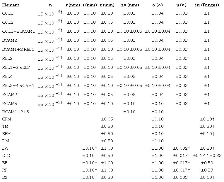 The tolerances are shown in Table 4. In the table, from left to right, we show the tolerances in: refractive index (n), curvature radius of each surface of the lens (r), thickness (t), position along the optical axis (z), decentering (∆y), inclination (α), surface inclination or parallelism (p) and surface irregularity (irr). The table is divided in three sections, the first corresponding to the lens parameters, the second to mirrors and the third to windows, filters and/or plates. The labels COL1+2, BCAM1+2, REL1+2, REL3+4 and RCAM1+2+3 refer to groups of lenses in their optomechanical barrel. The parameters with a dagger superscript are tolerances specified by an external manufacturer. While tolerances in some parameters are more restrictive in some elements than in others, when the difference is small we have maintained the more restrictive value for all the equivalent elements.