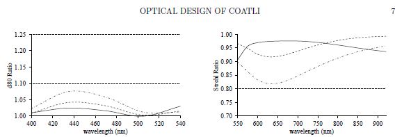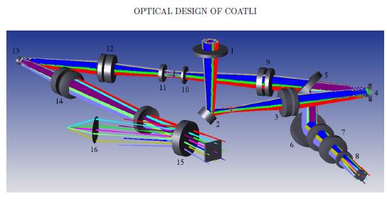 The authors would like to thank all the COATLI project members, with special thanks to Carlos Tejada for very useful comments regarding the optical design. All lens polishing will be done at the IA-UNAM workshops by Oscar Chapa and Luis Carlos Álvarez. The dichroic, filters, and anti-reflecting coatings are provided by Custom Scientific. COATLI has been funded by the Instituto de Astronomía of the UNAM, CONACYT proposals 232649, 260369, and 271117 (Laboratorio Nacional de Astrofísica en San Pedro Mártir), and UNAM/PAPIIT projects IG100414 and IT102715.