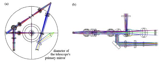 The novelty of the design lies in the fact that the instrument needs to deliver diffraction-limited images in the visible, in a wide FoV and a relatively broad spectral range. To our knowledge, no similar design has ever been reported. Other astronomical instruments with adaptive optics (AO) usually work in the near infrared and have a smaller corrected field. (Although, for large telescopes, this may be equivalent in terms of the number of Airy discs within the field). Typically, these instruments use mirrors for their powered optics to avoid chromatic aberration, and have only one or none pupil planes, which simplifies enormously the optical design. Examples of these are PUEO at the CFHT (Arsenault et al. 1994), NAOS at the VLT (Rousset et al. 1998), the Lick AO system (Gavel et al. 2000), or PHARO at Palomar (Hayward et al. 2001), to mention a few. FRIDA, the future AO instrument for the GTC (Cuevas et al. 2006), has demonstrated the excellent performance of achromatic lens systems for a diffraction-limited instrument, for an equivalent FoV (40 arcsec in a 10.4 m telescope vs 4 arcmin in a 0.5 m telescope, with the same amount of pixels on the detector, and both instrument being Nyquist sampled), but as the previous, FRIDA will work in the near infrared. In contrast, VisAO for the Magellan Clay telescope (Kopon et al. 2010) is an example of an AO instrument in the visible, in a 6.5 m telescope. However, this is a direct imaging instrument with almost no optics, since the telescope’s secondary mirror acts as the adaptive element, which provides a very small corrected FoV of 8.4 arcsec.
