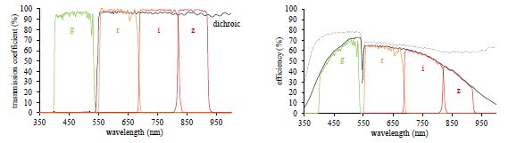 Filters and the dichroic are provided by Custom Scientific, as well as anti-reflecting coatings for all the lenses and the second surface of the beam splitter for the pupil camera. Given the relatively short wavelength range, transmissivity will be at least 99% per surface per lens. The requirements of COATLI define that the mean efficiency shall be greater than 35%, 35%, 25% and 15% respectively in the griz bands, excluding only the atmosphere and the central obturation of the telescope. The transmission curves for the five broad band filters and dichroic, and the estimated total efficiency for the two channels of COATLI are shown in Figure 5. This efficiency estimate takes account of the telescope, all the optics with coatings (lenses, mirrors, windows and filters) and the detectors.