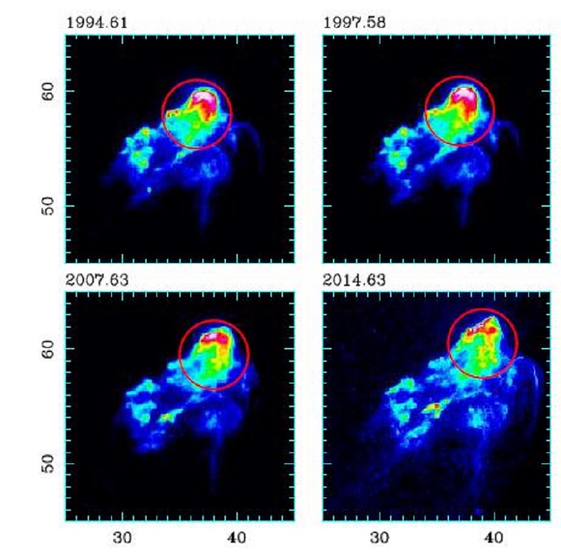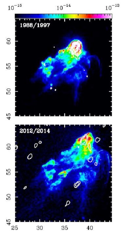For HH 2, we see that the 1988 VLA map shows two separate condensations (H to the SE and A to the NW, top frame of Figure 5). By 2012, condensation A has basically disappeared, and condensation H has strengthened considerably (botton-frame). A similar effect is seen in the Hα emission. In the comparison between the 2012 radio continuum and the 2014 Hα emission we see a clear morphological difference, which probably cannot be fully attributed to the proper motion of HH 2 (which corresponds to a shift of only ≈ 0.′′3 to the SE between 2012 and 2014, see Raga et al. 2016c).