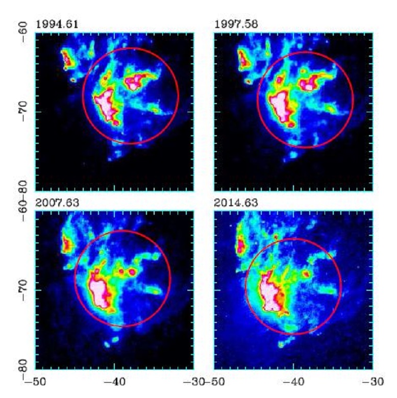 These images have been placed in approximately the same coordinate system as the VLA maps by centering the positions of the emission of the near environment of the Cohen-Schwartz star (visible in the Hα images and in the 1988.01 VLA map). This results in a ≈ 0.′′2 shift of the Hα images with respect to the positions derived from an astrometric calibration obtained using the positions of the C-S star and “star number 4” of Strom et al. (1985).
