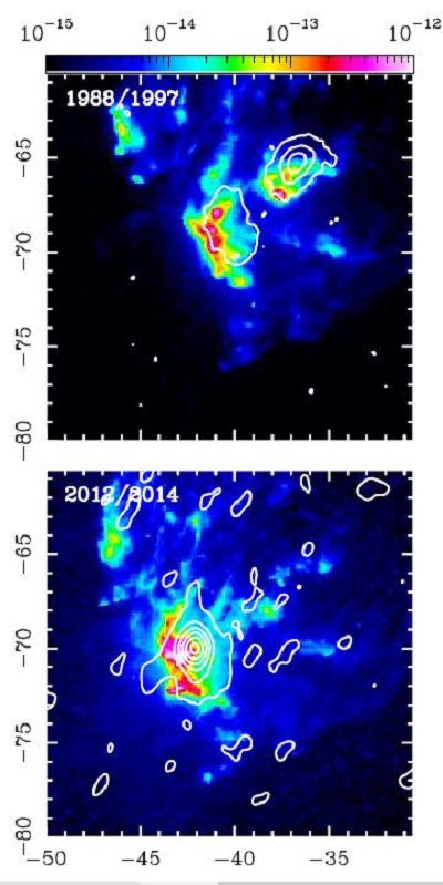 Resumen: Presentamos una comparación entre la evolución temporal en los pasados ≈ 20años de la emisión de radio continuo y de Hα de HH 1 y 2. Encontramos que el radio continuo y Hα de los dos objetos muestran evoluciones similares, con HH 1 debilitándose y HH 2 volviéndose considerablemente más brillante (aproximadamente un factor de 2). También encontramos que el cociente FHα/Fff (entre Hα y el radio continuo) de HH 1 y 2 tiene valores mayores que los encontrados típicamente en nebulosas planetarias (PNe), lo cual interpretamos como una indicación de que la emisión libre-libre y de Hα de HH 1/2 se produce en regiones emisoras con temperaturas menores (≈ 2000 K) que la emisión de las PNe (con ≈ 104 K).
