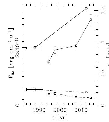 In Figure 6 we show the Hα flux within the diaphragms shown in Figures 2 and 3 (for HH 1 and 2, respectively). This figure also shows the radio continuum flux (integrated over diaphragms of the same sizes as the ones used for Hα) in the two available epochs.