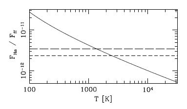 The predicted temperature dependence for this ratio is shown in Figure 7. In this Figure, we also show horizontal lines corresponding to the dereddened ratios obtained for HH 1 (short dashes) and HH 2 (long dashes). It is clear that the observed ratios would imply that the emission has a dominant contribution from regions with T ≈ 1000 → 3000 K.