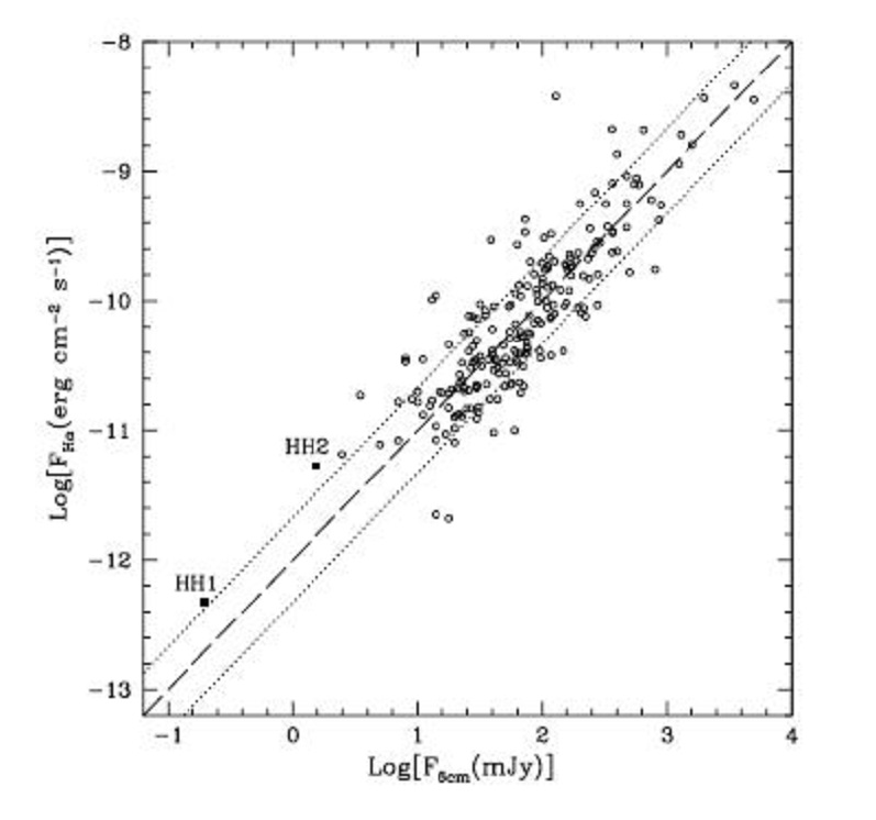 We note that we have not taken into account two small effects. On one hand, the free-free emission can have a contribution from ionized helium. This could introduce an extra contribution of the order of 10% to the free-free emission from pure hydrogen. On the other hand, the planetary nebulae radio data were taken at 6-cm (5 GHz), while the points shown for HH1 and HH2 were taken at 7.15 GHz. Assuming that we are observing optically thin free-free, the flux density is expected to go as ν-.01 and this will introduce an underestimate in the 6-cm flux density of the HH objects of about 4%.