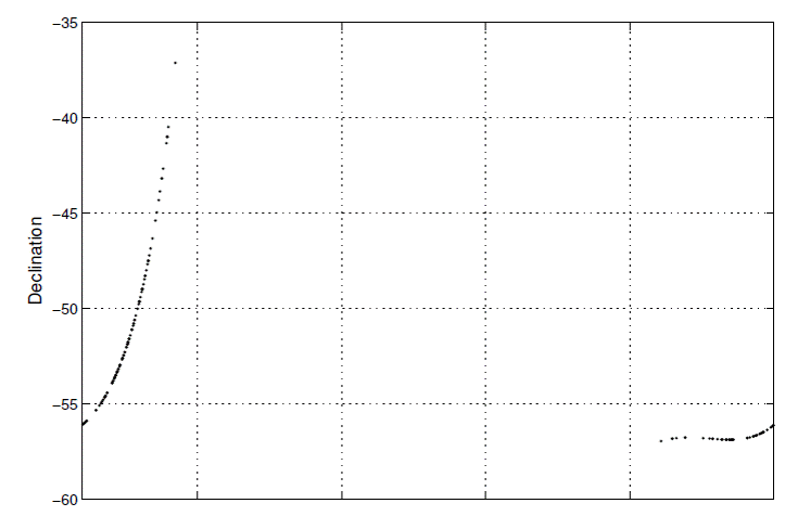 Comet C/1865 B1 (Great Southern Comet of 1865), which I now refer to as merely “the comet”, represents a particularly intriguing object. It was discovered at declination −37° and moved further south, see Figure 1, and thus was observed only in the southern hemisphere. Because northern hemisphere observatories were excluded and important southern hemisphere observatories such as Argentina’s Cordoba and La Plata not yet established, the number of observations is sparse compared with that of other great comets. Körber published an orbit in 1887 according to the Marsden and Williams catalog (2003). (A more recent version of the catalog was published in 2008, but I have the 2003 version. Both versions agree on the orbit for Comet C/1865 B1 as confirmed by the NASA JPL Small-Body Database Browser, https://ssd.jpl.nasa.gov/sbdb.). The orbit is parabolic and shows a small perihelion distance, 0.026 AU.; only 2% of the comets in the catalog have a smaller perihelion distance. Given that the orbit is 130 years old this particular comet merits study using modern techniques.