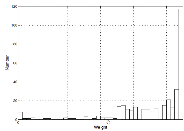 Figure 3 shows a histogram of the weights, only 8 of which are lower than the machine ε of 2.2·10-16 but of which the others exhibit slight bimodality. 93% of the weights are greater than 0.5.