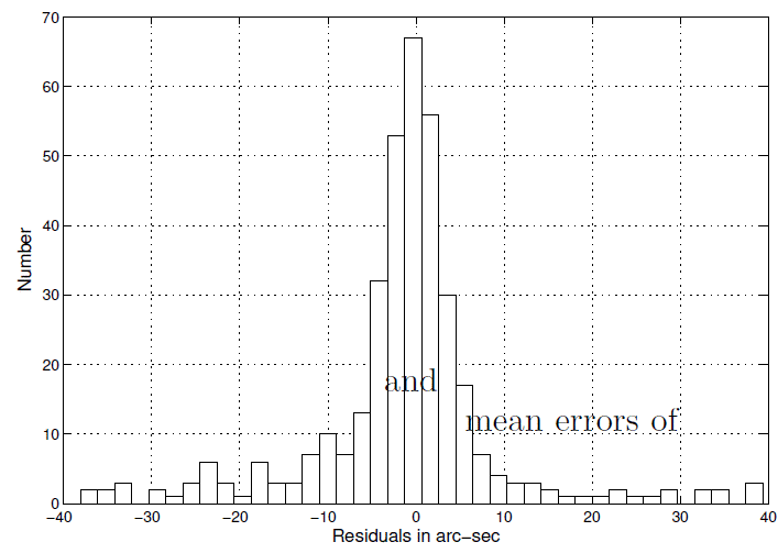 Although a nonparabolic orbit has been calculated for the comet, how good is it? Figure 4 shows a histogram of the residuals and Figure 5 the residuals themselves. The skewness of the residuals is 0.03, their kurtosis 1.94, and Q factor of 0.44. Because a normal distribution has a kurtosis of 3, a Q factor of 2.11, and 0 skewness we see a flatter distribution with lighter tails and somewhat skewed. Thus, the residuals are platykurtic and lighter tailed than the normal distribution. What about randomness for determining the goodness of the solution, even more important than the hardly ever achieved in reality normality? A runs test (Wonnacott and Wonnacott 1972, pp. 409-411) calculates a 39.2% chance that the residuals are random. Another test of randomness, the Durbin-Watson statistic, also called the mean-square difference test, (Wonnacott & Wonnacott 1972, pp. 411-413) gives the residuals a 78.6% chance of being random. The two tests measure different properties of the residuals: the runs test the tracking above and below 0 and Durbin Watson the serial correlation of a residual with its successor. The residuals, therefore, are random and evince no indication of serious systematic error. One may conclude that the least squares solution seems satisfactory.