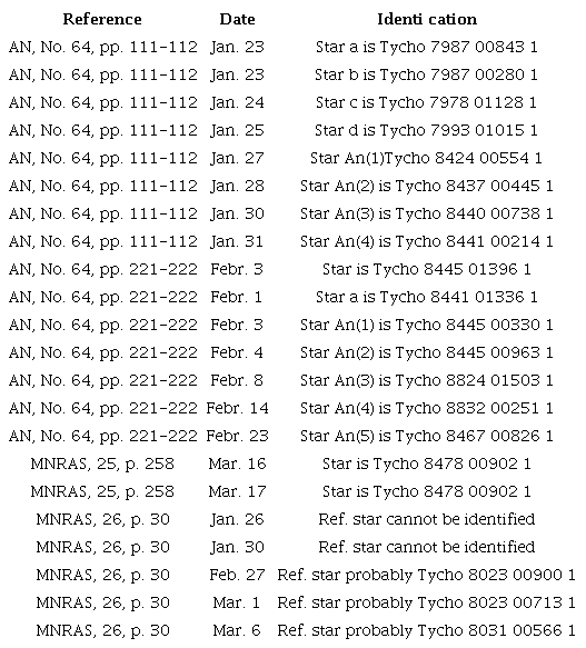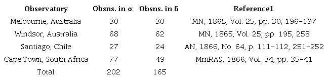 There seem to be few errors in the observations and for those that are I can find no reasonable explanation to convert a bad observation to a good one, e.g., wrong reference star or transposed digits. There are, however, numerous reference stars not identified by the observer. Because the bulk of these are from the Cape Observatory, I give these in a separate table, Table 2, and the remaining in Table 3.