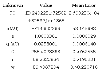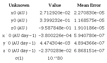 Tables 6 give the orbital elements corresponding to the rectangular coordinates of Table 4: the time of perihelion passage, T0; the eccentricity, e; the semi-major axis, α; the perhelion distance, q; the inclination, i; the node Ω; and the argument of perihelion, w. The calculation of the mean errors of the orbital elements proceeds via Rice’s procedure (1902). Let Cbc the covariance matrix for the least squares solution for he rectangular coordinates and velocities.