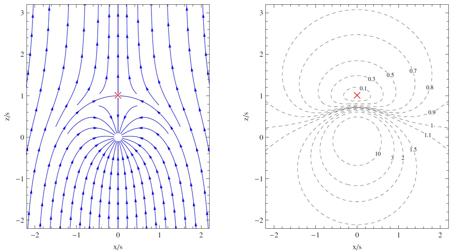 Now that we have an expression for the velocity field and the streamlines of this model; we can proceed to visualize the resulting accretion flow. In Figure 1 we show the streamlines of this model together with isocontours of the magnitude of the velocity field. The red cross in this figure indicates the location of the so-called stagnation point where, according to Equations (18) and (19), the velocity field vanishes. From these equations we can see that it is located at r = s, θ = 0. On the other hand, from Equation (22) we can show that the unique streamline that ends up at the stagnation point is characterized by the critical impact parameter bc = 2s. Moreover, this same streamline separates the flow into two regions: all the streamlines with an impact parameter b < bc end up accreting onto the central object (constituting thus the accretion basin) while those with b > bc escape to infinity.