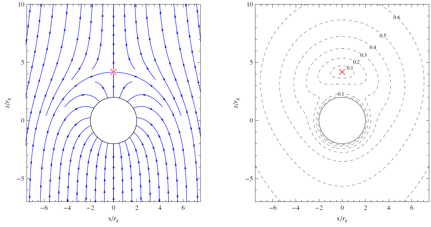 In Figure 2 we show the streamlines and isocontour levels of the velocity field of the PST model for the particular case σ = 3 rg which, from Equation (45), corresponds to a wind speed at infinity of v∞ ≃ 0.44 c. From this figure [and also from Equations (41) and (42)] we can see that, in addition to the stagnation point, the velocity field also vanishes at the event horizon r = 2 rg . This is only a coordinate effect related to the fact that the light cones close onto themselves when described in terms of the coordinate time t, which implies that t is not well suited for describing physical processes close to the event horizon. Indeed, from Equations (36), (37) and (38), we can see that the velocity components dr/dτ and dθ/dτ do not show this behavior.