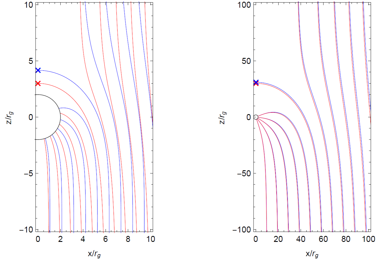 Finally, in order to facilitate the comparison between the Newtonian and the PST models, in Figure 3 we show the corresponding streamlines side by side for two cases: s= σ= 3rg ands=σ=30rg. From Equation (45) it is simple to see that σ ≫ rg implies v∞ ≪ c. Therefore, as the ratio σ/rg grows, the non-relativistic limit should be recovered, just as we can confirm by comparing the left and right panels of this figure.