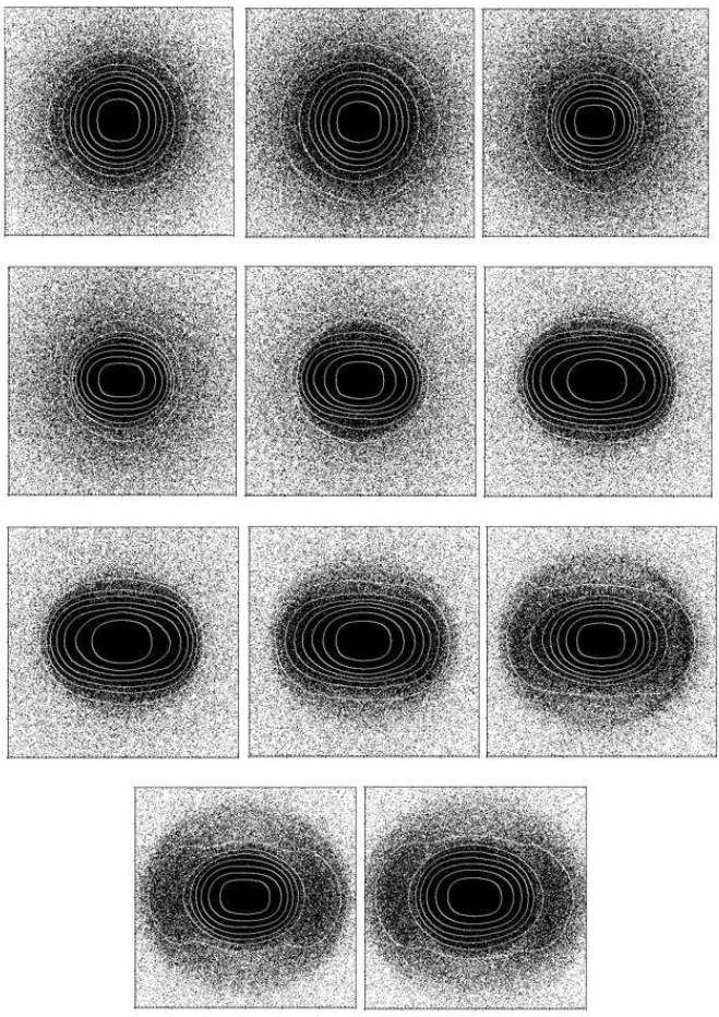 In Figure 8 the resulting intrinsic shapes of the simulated and rotated galaxies are shown through their projections on the XY, XZ, YZ planes for the 80% mbp. Radial orbit instability takes place and is responsible for deforming the originally spherical systems, which gradually adopt a typical spheroidal/triaxial shape. Our results show that the final intrinsic shapes of the relaxed models are truly prolate.