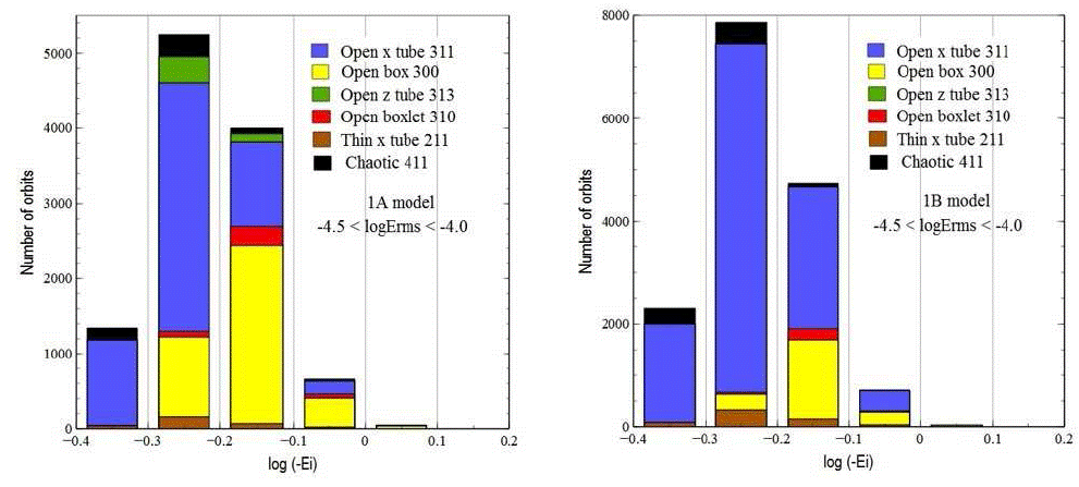 We wanted to minimize the individual particle energy errors of our selected orbits even further. In the end, it was this criterion that ultimately defined the robustness of the individual orbit extraction and classification process. We accomplished this goal by doubling and even quadrupling the integration time of Models 1A and 1B, as we kept close track of the conservation of total energy. As expected, longer runs allowed us to consider those particles with small, intrinsic individual energy errors that, at the same time and given a sufficiently long time interval, were able to complete a larger number of orbital periods. Smaller individual energy errors together with a larger number of completed orbits per particle was possible at the expense of the conservation of total energy of the systems; the fractional error (Efe) was now ≈ 10-5, still acceptable for the purposes of this work.
