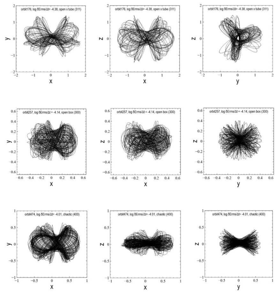 Histograms with the number or particles for each orbit type as a function of binding energy are shown in Figure 10. The preponderance of long-axis tube and open box orbits is obvious in both models, and even though their relative abundances change, open x tubes dominate the orbital makeup with at least 50% of the total number of particles in both models. Chaotic orbits contribute 5% of the total number of selected particles in our prolate and prolate-like systems. XY, XZ and YZ projections of the three most abundant orbit types resulting from this classification exercise are shown in Figure 11.