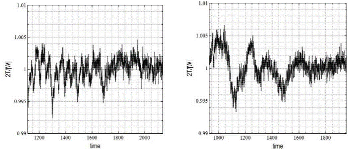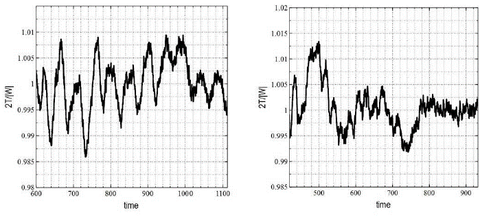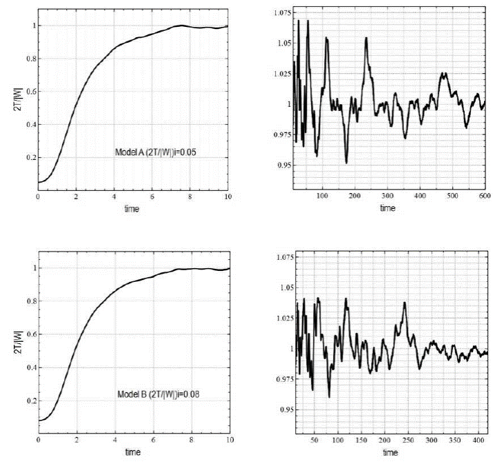 Once relaxed from the small fluctuations of the virial ratio around unity, Figure 3, Models A and B were evolved and integrated for 85 crossing times. The resulting configurations after this process were then called Models 1A and 1B. During the integration, possible changes in the total energy of the system were constantly monitored. The virial ratio (2T /W ) showed negligible oscillations around unity, with mean variations smaller than 1% (Figure 4).