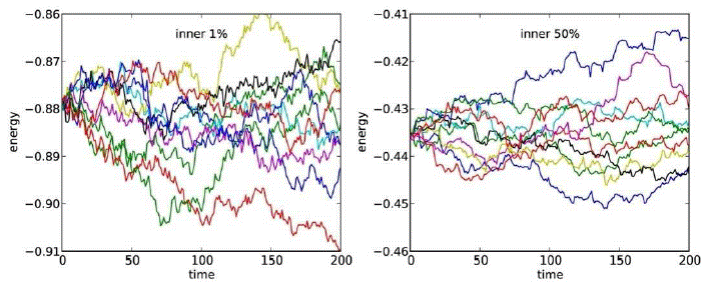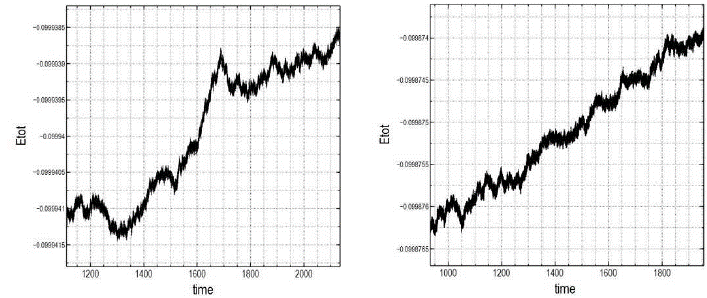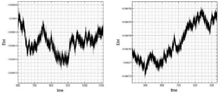 As a comparison, Figure 18 shows the individual energy fluctuations versus time for a sample of 10 particles in a similar gyrfalcon simulation of a Plummer sphere with 106 particles. The integration time is 200 tcross, comparable to that of Model 2A (170 tcross). The paths of individual particles in both graphs show indeed the expected random walk, which is more evident in the most bound particles (left diagram). It must be emphasized, however, that this N -body simulation did not incorporate the optimal parameters to minimize the total energy conservation errors.