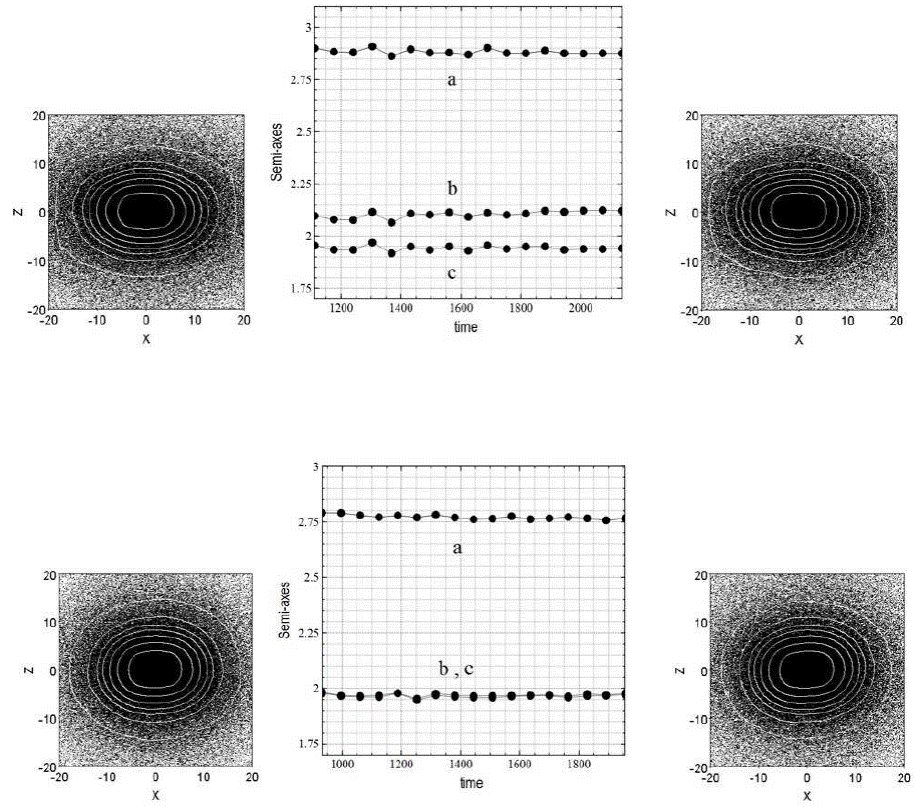 Additional support for the high stability of the final configurations, confirming the fact that the gravitational potential was no longer time-dependent, came from the constancy of the systems’ principal semi-axes a, b and c in Models 2A and 2B (Figure 14), confirmed by the XZ projections of both spheroids -the plane on which the systems’ elongations are more evident-, which show a constant, final ellipsoidal geometry. Compare the initial and final frames of the integration interval of 170 tcross. These were the ideal conditions for the orbit extraction stage.
