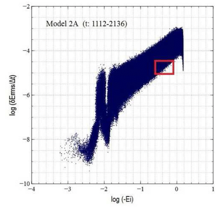 Given the excellent conservation of total energy in our initial two models, we performed two extended N-body simulations (named Model 2A and Model 2B) of our initially cold-collapsed configurations. Fundamentally, these extended runs were aimed at “capturing” a subsample of less gravitationally-bound particles with smaller rms errors in their individual energies that, given a sufficiently long integration interval, could also cover a minimum of 80 orbital periods for a robust classification. Thus, these orbits would meet the first two selection criteria described above, plus a stricter third one, since our goal this time would be to reach at least an rms error in the interval