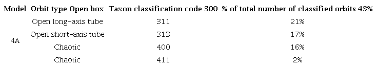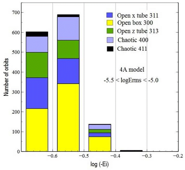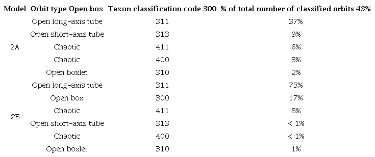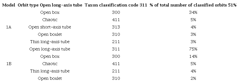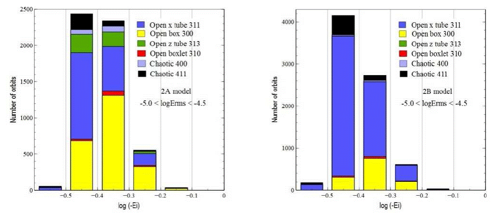 Hence, at the expense of a small loss of accuracy in the conservation of total energy, more particles with smaller individual energy errors and better time-sampled orbits became available, the key to a robust orbit classification. Table 4 shows the main orbital families classified by taxon once 5493 particles in Model 2A and 7734 in Model 2B met the first two previously established criteria for Model 1A, plus a larger individual energy error interval (10-5.0 - 10-4.5 in this case). Figure 16 presents the histogram as a function of binding energy corresponding to the orbit types in Table 4.