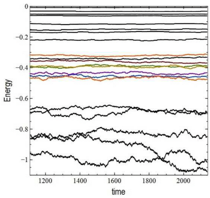 A good, straightforward way of verifying the conservation of individual particle energies in our Nbody simulations, in addition to the “giraffe plots”, is a plot of the fluctuations of the individual energies of those particles as a function of time through the full integration interval of Model 2A (t: 1112-2136, ≈ 170 tcross). Such a plot is shown in Figure 17 for a sample of particles within an arbitrary interval of energies.