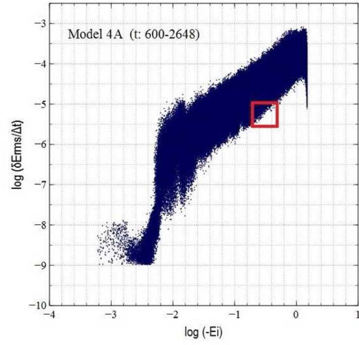 After performing the stability tests, we analyzed the conservation of energy of individual particles in our systems. Although the total energy fractional errors (Efe) of Models 2A (2.6×10-5) and 2B (2.4×10-5) were greater than those of their corresponding progenitors, we were able to sample a population of particles whose individual energy root mean square errors reached 10-5.0 - 10-4.5 (Figure 15).