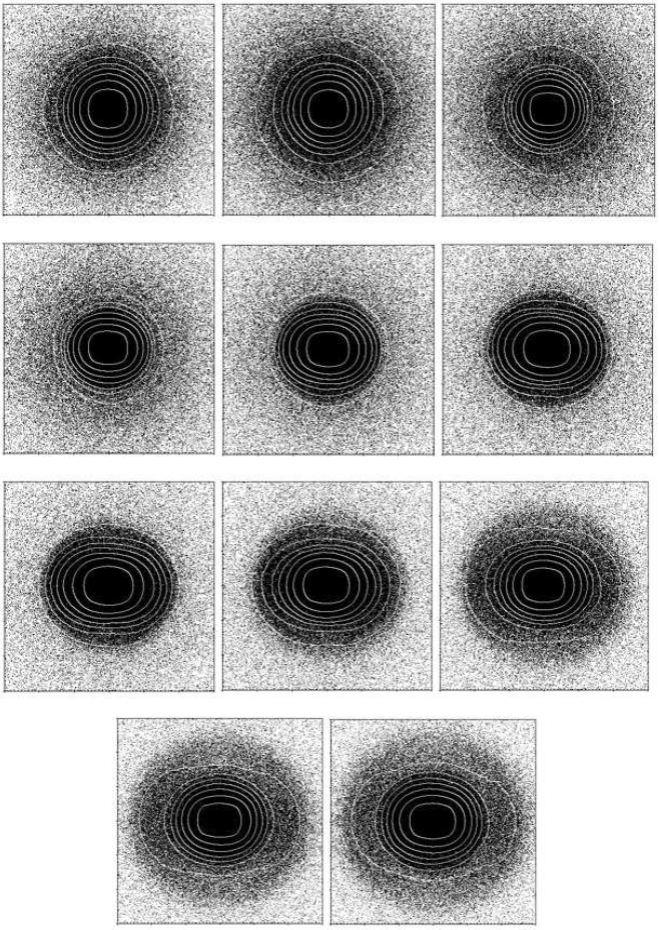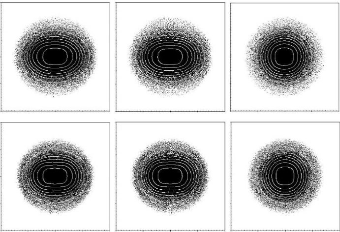 Projections on the plane that contains the major and minor axes of the collapsing configurations are shown in Figure 1 for Model A and Figure 2 for Model B. Figure 3 shows the run of the virial ratio as a function of time. In both cases the virial ratio settles within 10% of its equilibrium value within 6 time units (1 tcross). After this, fluctuations of 0.6% for Model A and of 0.4% for Model B are present. Model A was simulated for 600 time units, Model B for 420 time units, which corresponds to 100 and 70 standard crossing times (tcross), respectively. Here, tcross = (R3/GM)1/2. The energy is conserved to the level quoted in Table 1.