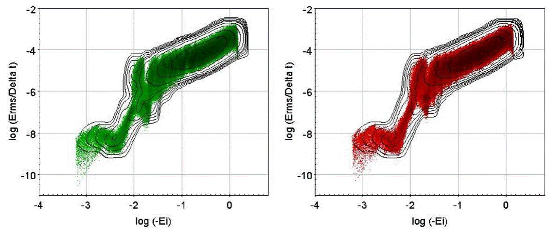 A good way of assessing the conservation of energy of individual particles is through the root meansquare error (rms) of individual particle energies over the full integration interval (85tcross). The rms error of individual energies was calculated for all the particles in both models. The resulting plots of log(δErms/∆t) versus initial energy for each of the 106 particles of each model are shown in Figure 6 (“giraffe plots”, given its resemblance to the African mammal’s head and neck).