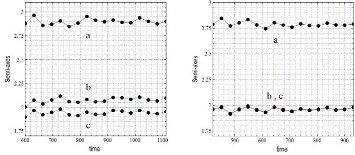After the orbit integration process was completed, we were able to determine the final, intrinsic shapes of our relaxed systems of particles. For this, we computed the tensor of inertia (TOI) at t=1112 (Model 1A) and t=932 (Model 1B); this allows to line up the systems’ principal axes with the (x, y, z) coordinate axes. We did this by considering 80% of the most tightly bound particles using nemo, as well as their corresponding eigenvectors and eigenvalues. The semi-axes (a, b, c) of our final configurations were determined from the square roots of the eigenvalues, and we plotted a, b and c as a function of time during the full 85 postrelaxation crossing times of these simulations to verify their constancy. Figure 7 illustrates the small changes in time for the two models considered, thus confirming that our systems had reached a steady state within 5% fluctuations of the TOI eigenvalues.
