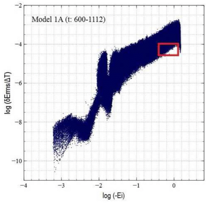The particles of Model 2A, whose energies are shown in the uppermost and lowermost regions of the diagram, were randomly selected to cover the energy interval. The middle region centered at E ≈ −0.4 is occupied by a subsample of 5493 selected orbits whose individual energy rms errors lie in the interval −5.0 < log(δErms/∆t) < −4.5. The small errors are justified by the constancy of these particles’ paths in Figure 17. Even though the characteristic random walk describing the variations of such energies in time is obvious for the most bound particles (lowermost region where E < −0.6), which are more exposed to interactions with neighbors, the least gravitationally bound particles (E > −0.2) are much less subject to these encounters, so their initial, individual binding energies tend to remain unchanged in time. In Figure 17, such particles define orbits along which the binding energy is practically constant. However, most of them have not completed a minimum number of periods to be reliably sampled and classified, not even in our longest run of 340 crossing times (Model 4A).