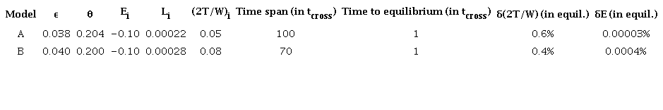 Our initial conditions are 106 particle, isotropic Hernquist spheres (Hernquist 1990), scaled out of equilibrium to have a binding energy of -0.1 and an initial virial ratio of 0.05 (Model A) and 0.08 (Model B). A million particles was chosen because it was the largest set we could integrate within a reasonable time with the computing infrastructure at our disposal. As we will see later, this was enough to bring down collisional effects to a level that would not preclude our successful orbit extraction during the time window we employed.
