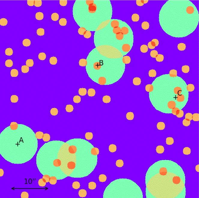 on a zero intensity background, we add the intensities of two populations of circular “spots”: a first population with a radius of r1 = 1´´ and a (dimensionless) intensity I1 = 3, and a second population with r2 = 5´´ and I2 = 1;