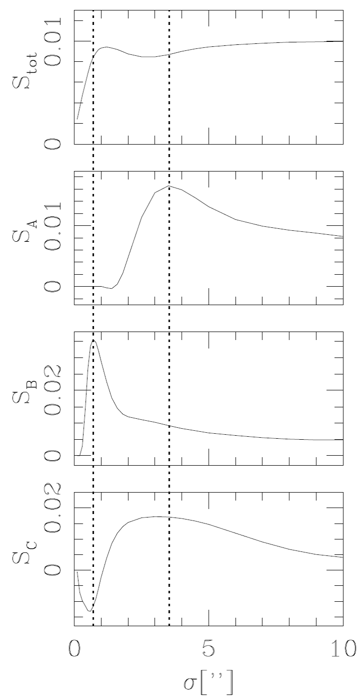 the spatially integrated spectrum Stot(σ) (top frame) shows a peak at a radius of ≈ 1´´, corresponding to the small, bright spots (of the first population of spots, see above). The population of faint, large spots does not produce a maximum in Stot, but instead coincides with an inflection point in the spectrum (seen at σ ≈ 5´´ in the plot). This possible appearance of characteristic sizes as inflection points in the spatially integrated wavelet spectra has been discussed by González-Gómez et al. (2010);