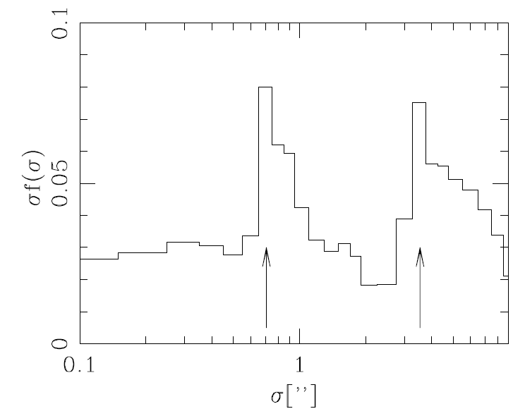 It is clear that it is easier to determine the characteristic sizes of the emitting structures from the size distribution function σf(σ) (Figure 9) than from the much smoother, spatially integrated wavelet spectrum (top frame of Figure 8). Because of this, in the present paper we analyze the size distributions of the images of HH 1 and 2 in order to determine the evolution of the characteristic sizes of their emitting structures.