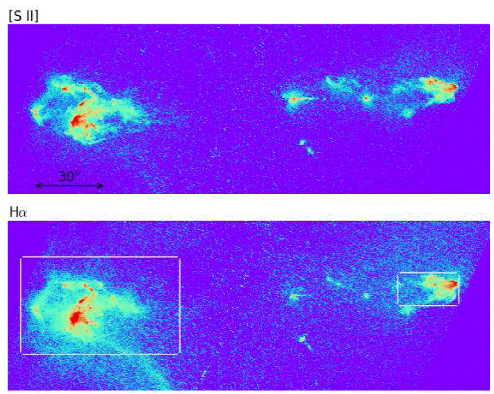 Figure 1 shows the 2014 Hα and [S II] images, rotated 37° clockwise, so that the axis of the outflow is approximately parallel to the abscissa. The outflow source (seen at radio and IR wavelengths, see e.g. Rodríguez et al. 2000 and Noriega-Crespo & Raga 2012) is located in the central region of the frames.